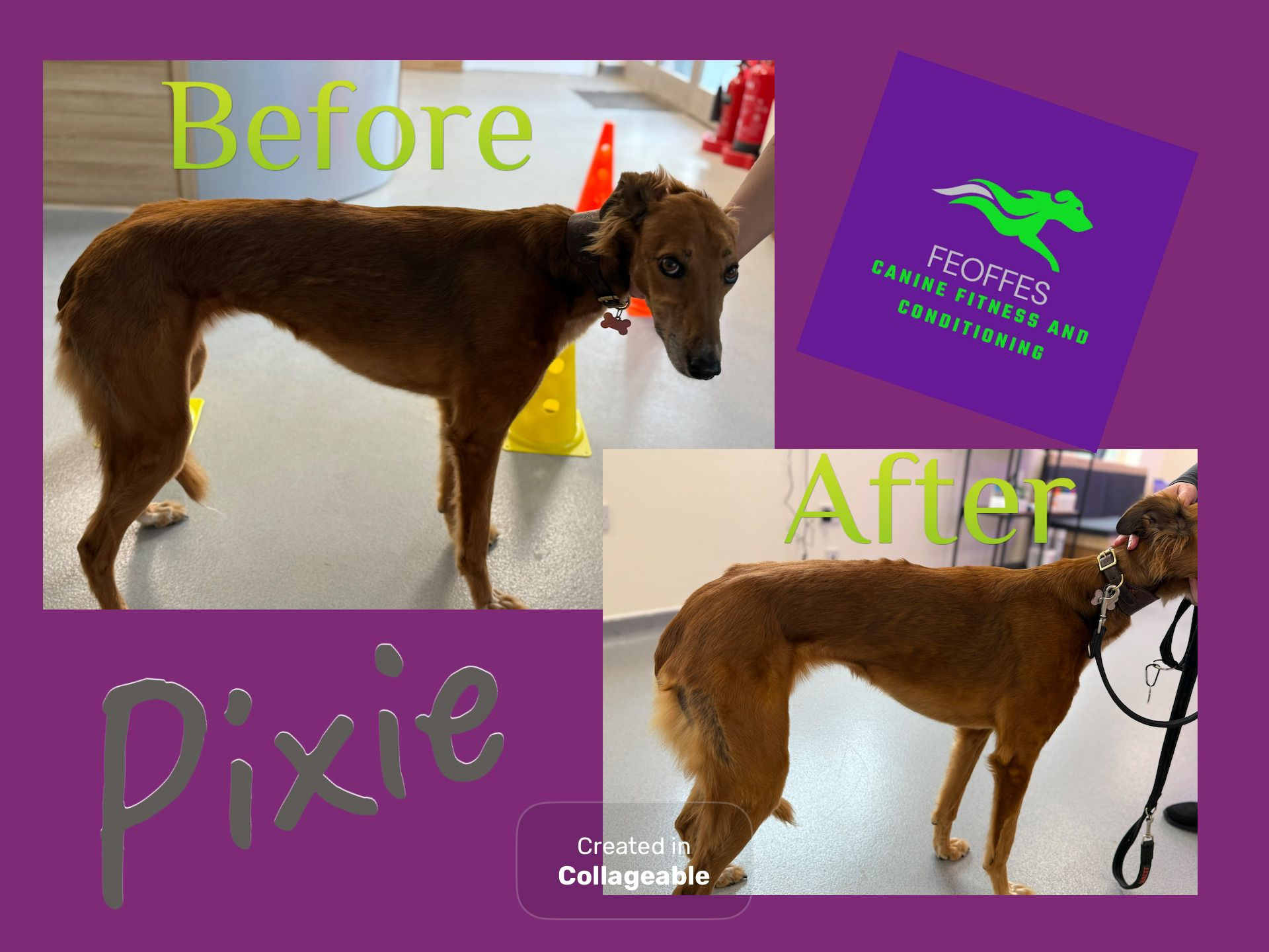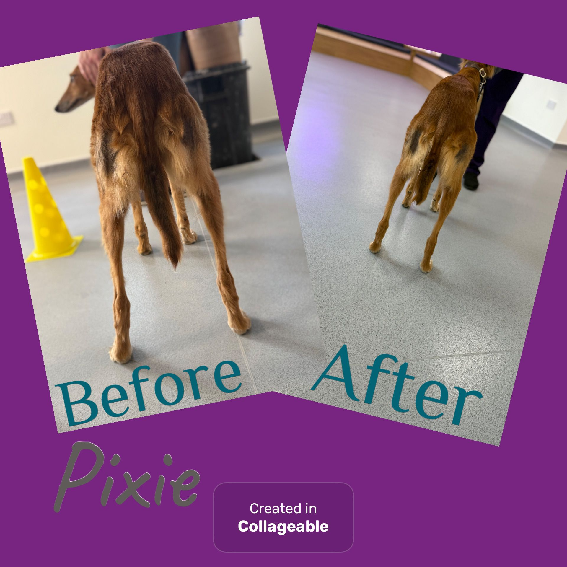 Katy picked up that Pixie’s muscles down her right side were much smaller than her left; and she was painful on her hip and wrist joint. The before pictures show that Pixie wasn’t standing straight, to compensate for her sore joints. She was sent home with pain relief and a set of exercises to carry out three times per week. As you can see in her after pictures; Pixie’s posture improved vastly over the first three weeks and by week six her muscles on both sides were even.